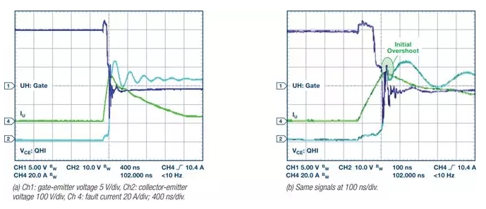 IGBT技术的发展正在促成增加短路电流电平,但降低短路耐受时间这一趋势。此外,技术的进步导致使用芯片尺寸更小,缩小了模块尺寸,但降低了热容量,以至耐受时间进一步缩短。另外,还与IGBT集电极-发射极电压有很大关系,因而工业驱动趋向更高直流总线电压电平的并行趋势进一步缩减了短路耐受时间。过去,这一时间范围是10 μs,但近年来的趋势是在往5 μs以及某些条件下低至1 μs方向发展。此外,不同器件的短路耐受时间也有较大的不同,因此对于IGBT保护电路而言,通常建议内建多于额定短路耐受时间的额外裕量。