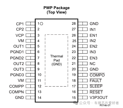 18V、3A三相无刷无感驱动、180˚正弦,集成驱动算法+预驱+MOS |