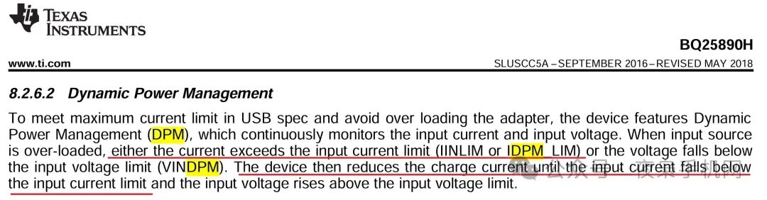 Pin = PSYS + PBAT,当系统抽载较大,导致IBUS电流达到ICL设定的限流值时,便触发DPM环路,此时进电池电流减少,直到IBUS小于ICL。外在表现为充电器优先为系统供电,不惜牺牲充电电流值。
