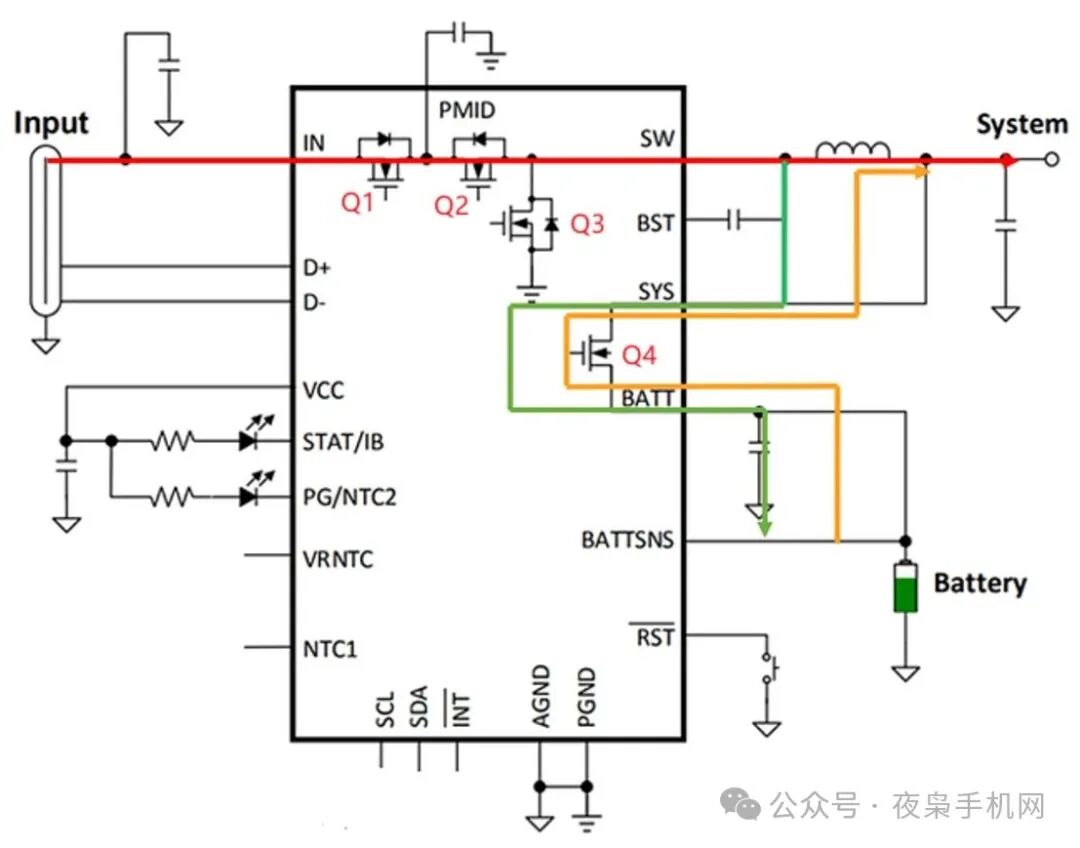 如果问手机上的Buck charger有什么独特之处,那么路径管理功能(Power Path Management)便是绕不开的一个话题。路径管理功能决定了电能如何在充电器、电池和系统供电这三者之间高效、安全地流动。