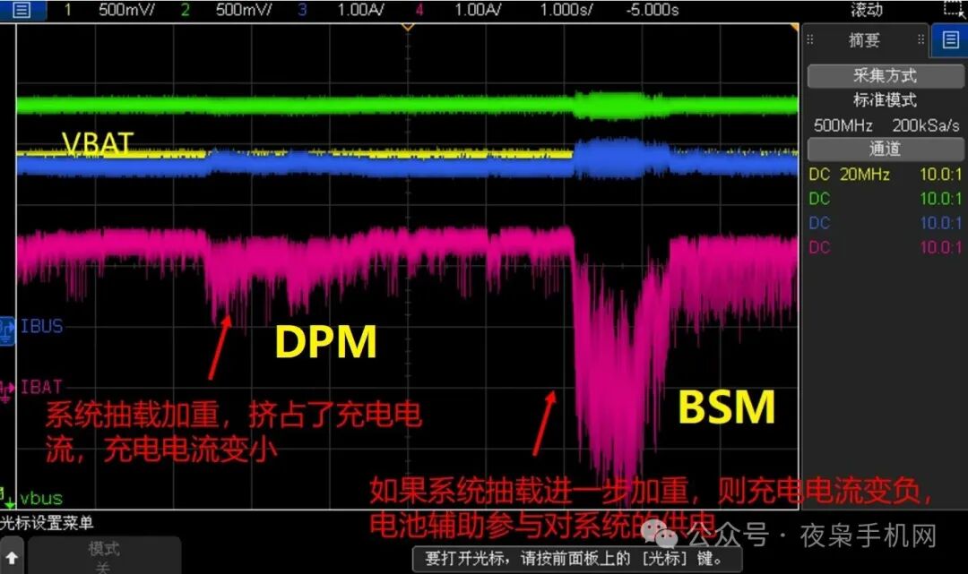 如果手机系统的抽载特别重,即使把电池的充电电流降为零(Q4管关闭),仍然不能满足系统抽载时,系统就会进入BSM(battery Supplement Mode)模式。此模式下,电池会转换为放电状态,然后与充电器一起给系统供电。