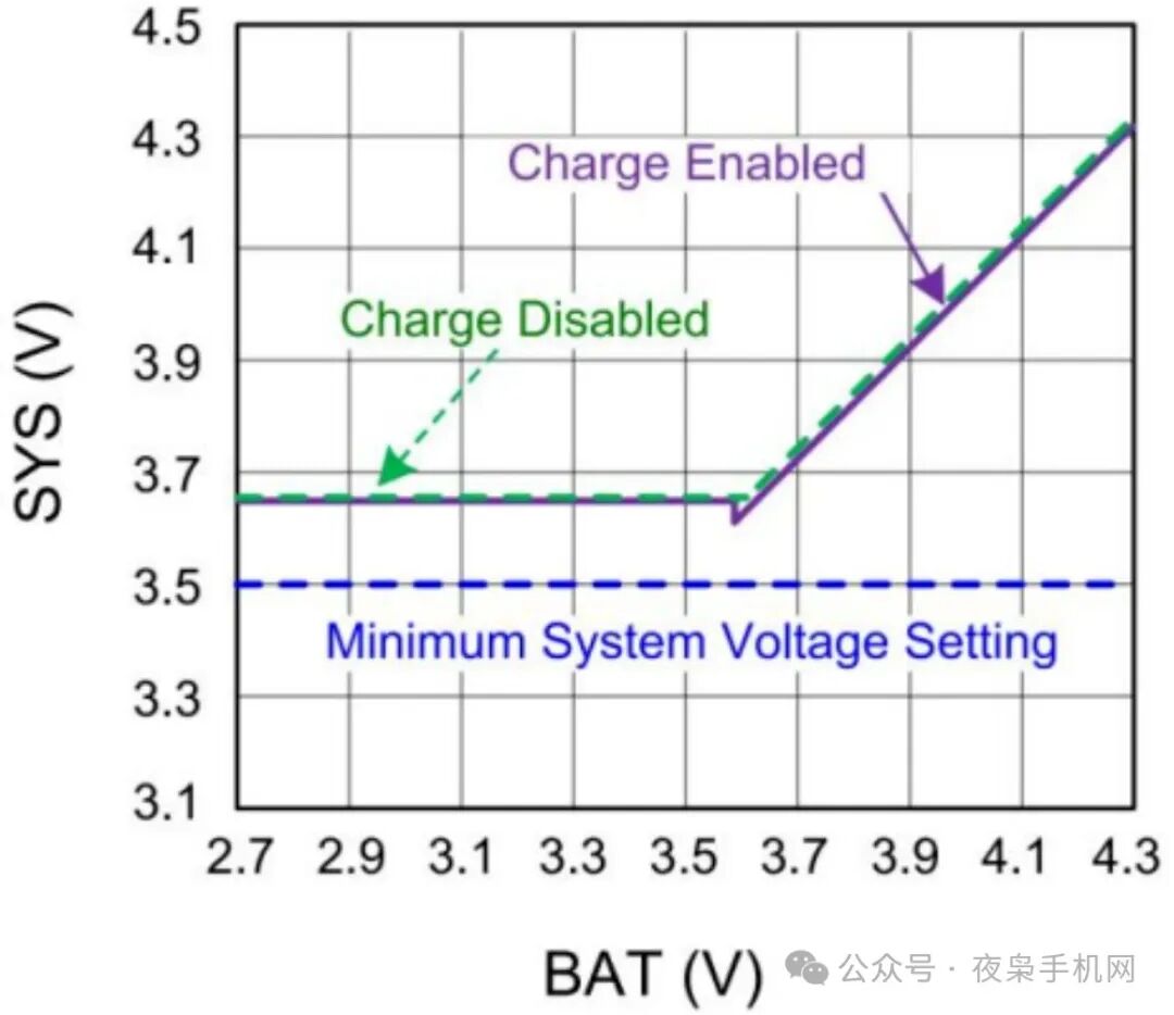 如下图,如果VBAT低于设定的最小系统电压时,BATFET将会运行在线性模式(LDO mode),此时充电IC输出的Vsys电压将会比设定的最小系统电压高150mV;当VBAT上升到比最小系统电压高时,BATFET将完全导通(full on mode),此时充电IC输出的Vsys电压被调节在比电池电压高70mV左右的一个电压。