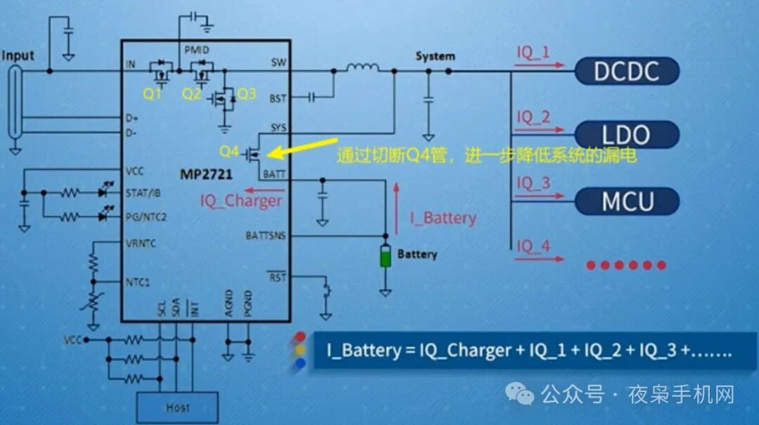 以MPS家的某buck charger IC为例,其未开启运输模式时待机功耗为44μA ,而开启运输模式后待机功耗只有8.5μA ,而这就是通过关断Q4管实现的。
