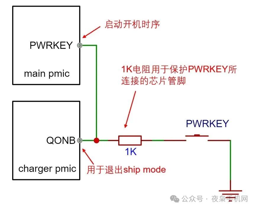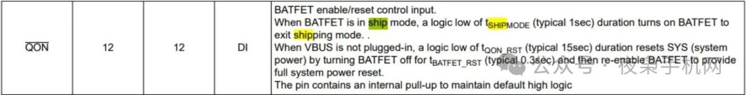 buck charger IC有个QON引脚,用于控制运输模式的退出,在手机电路上通常连接到开机键。这样用户第一次开机的动作就让手机退出运输模式了。此外,除了按开机键,我们插入充电器,也可以自动退出Ship Mode。