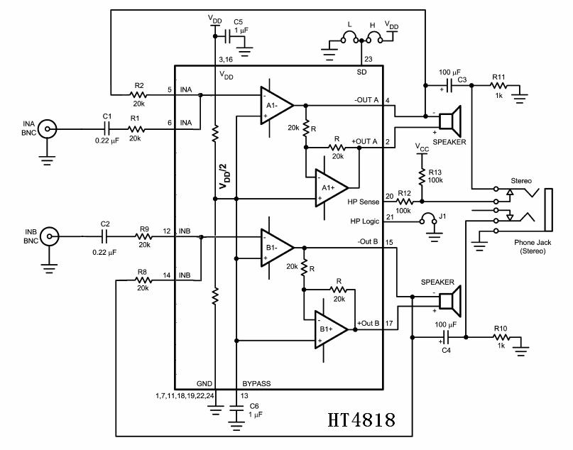 HT4818这款芯片设有低功耗的停机模式及过热停机保护功能。此外,这款芯片也设有特别的电路,可以抑制系统启动时的“开关/切换”噪音。现采用QFN-24封装.管教兼容LM4888,SN4088。
