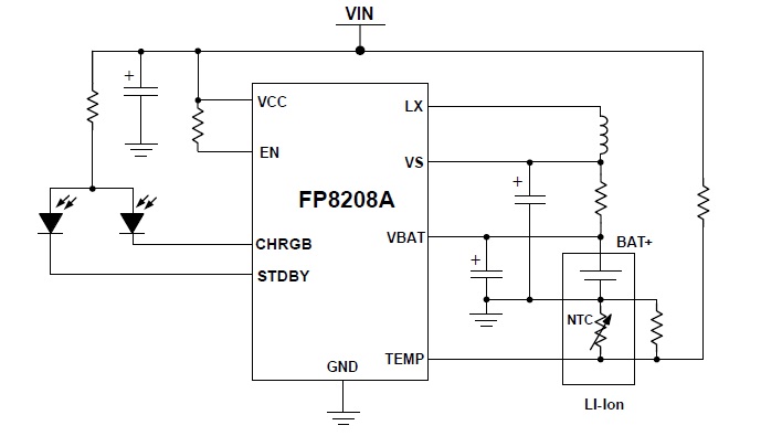 FP8208A 是一款開關模式降壓型鋰電池充電管理芯片,輸入電壓應用適合5V 交流適配器,可對單節鋰離子電池進行定電流或是恒壓充電,其最大充電電流為3.5A,最大充電電流可由外部電阻進行設定 |