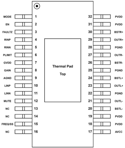 - THD+N ≤ 0.02% 测试条件 1W, 1kHz,4Ω, PVDD=32V