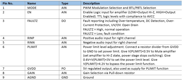 提供功率限制功能选项和喇叭直流保护功能,避免喇叭受到损伤。另外有短路保护功能,过温保护,过压,欠压保 护等功能避免器件受到损伤.