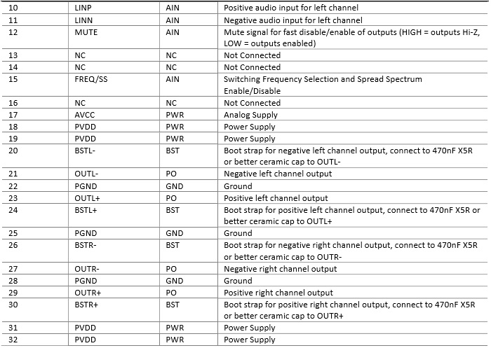 - 低静态电流: <30mA, PVDD=24V, 输出LC =10uH+0.68uF