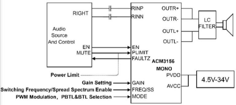 ACM3156工作电压范围在 4.5-34V,输出配置可以立体声BTL,也可以单通道PBTL。